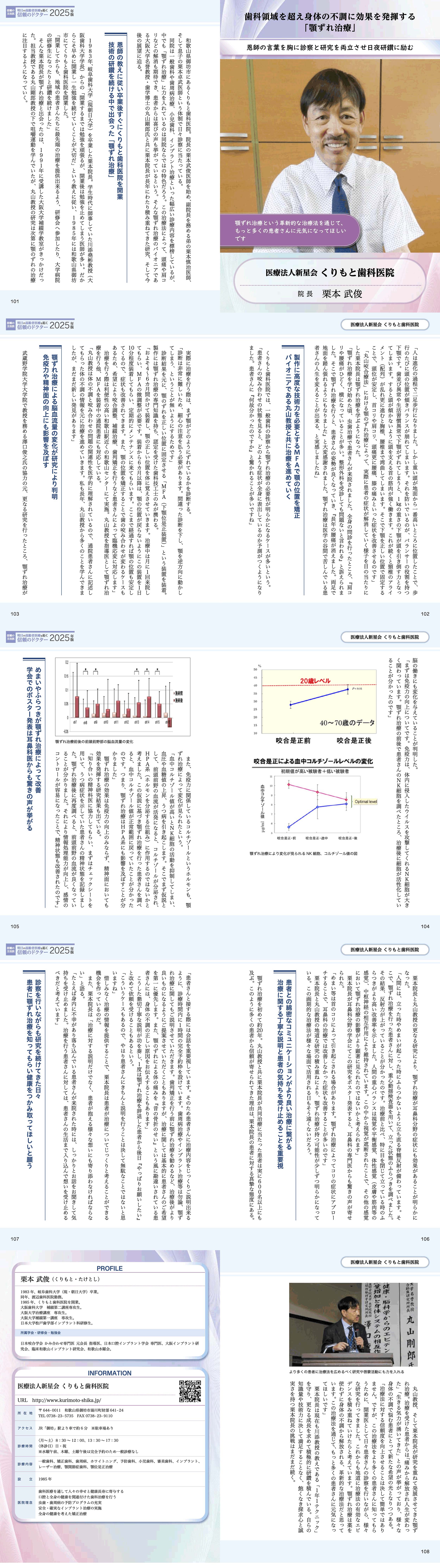 | 和歌山県御坊市にあるくりもと歯科医院。院長の栗本武俊医師を始め、副院長を務める弟の栗本慎治医師、そして息子の栗本卓武医師という体制で日々診察に当たっている。 同院は一般歯科や歯周病治療、小児歯科、インプラント治療といった幅広い診療内容を標榜しているが、中でも「顎ずれ治療」に力を入れているのは同院ならではの特色だろう。この治療法によって、頭痛や肩コリなどの解消も期待でき、患者からは喜びの声も挙がっているという。そんな顎ずれ治療のパイオニアである大阪大学名誉教授・歯学博士の丸山剛郎氏と共に栗本院長が長年にわたり積み重ねてきた研究、そして今後の展望に迫る。 |